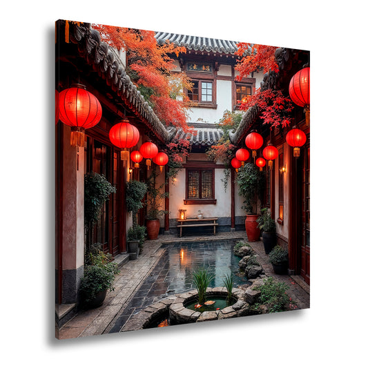 Leinwandbild Laternenlicht im Hof – Herbstgold küsst fernöstliche Stille.