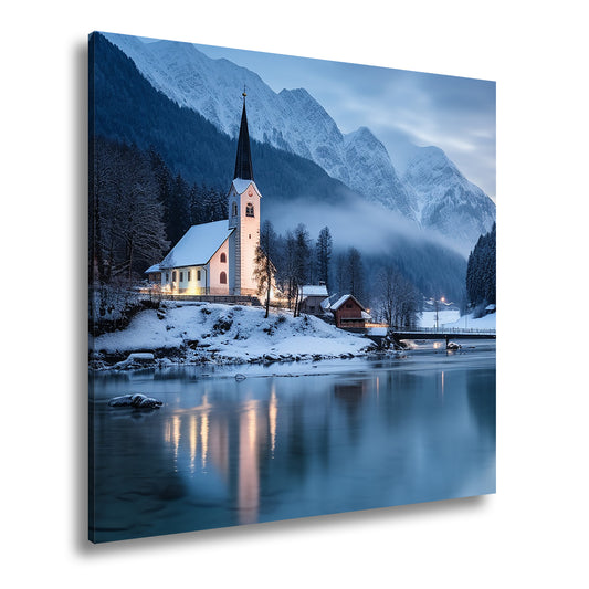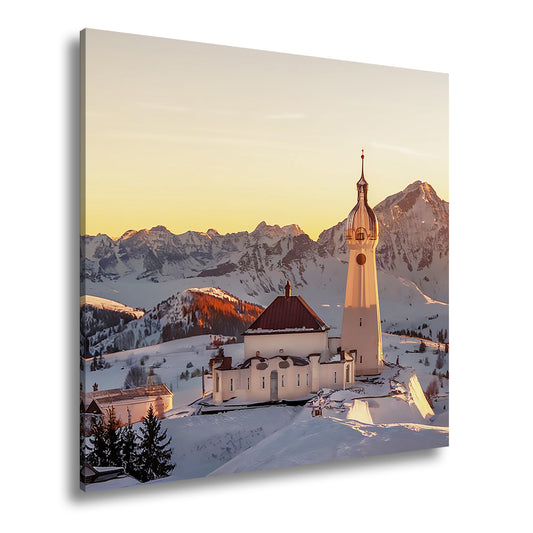 Leinwandbild Winterkirche im Alpenglühen – Stille trifft Erhabenheit.