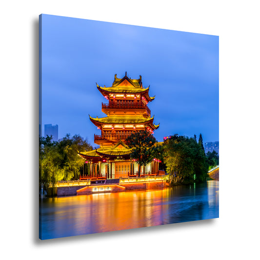 Leinwandbild Pagode im Abendglanz – Tradition spiegelt sich im Wasser.