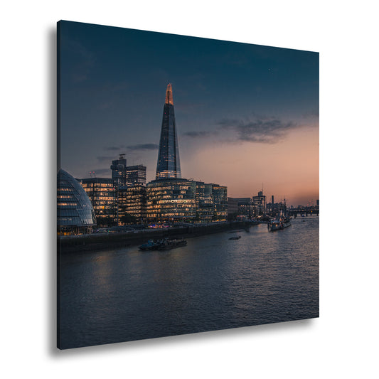 Leinwandbild Stadtlichter am Fluss – London erwacht in der Dämmerung.