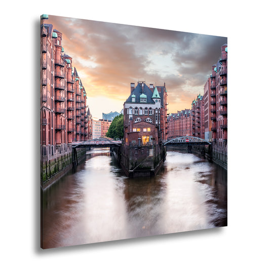 Leinwandbild Backsteinromantik in Hamburgs Speicherstadt bei Sonnenuntergang.