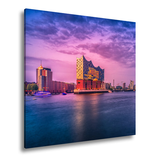 Leinwandbild Hafenzauber mit Elbphilharmonie im goldenen Morgenlicht.