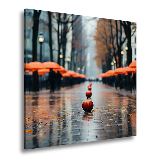 Leinwandbild Regenschirme tanzen im Takt der Tropfen auf Asphalt