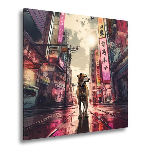 Leinwandbild Ein Hund im Neonlicht – einsam in der Großstadtpracht.