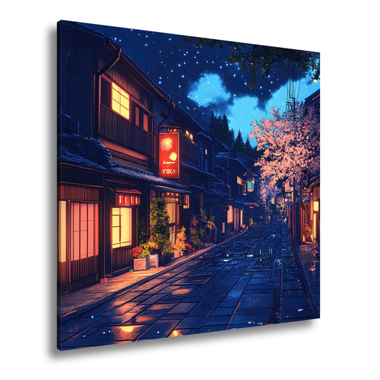Leinwandbild Lichterglanz auf nasser Gasse unter funkelndem Sternenzelt.