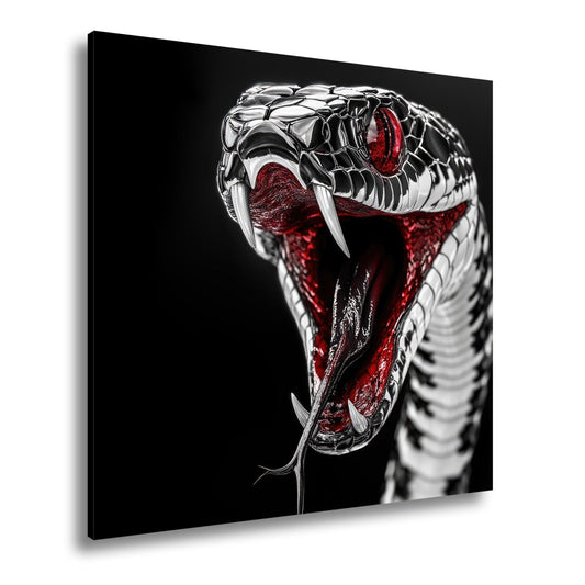 Leinwandbild Chromglänzende Schlange – Leuchtend roter Blick XXL