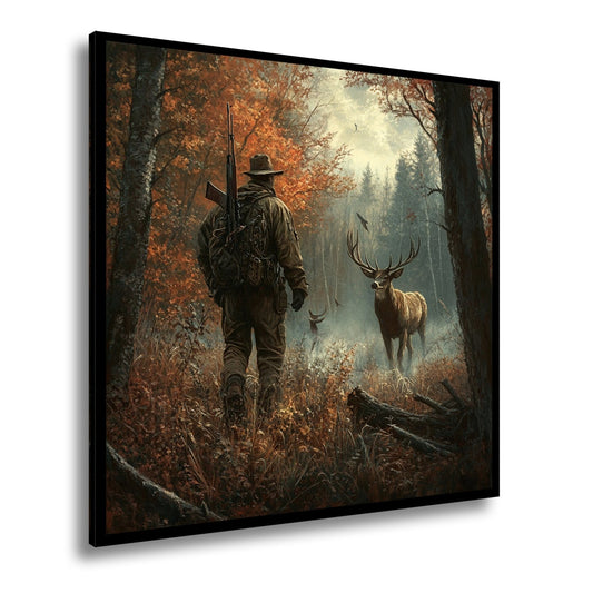 Leinwandbild Jäger XXL – Stille Begegnung mit Hirsch im Herbstwald