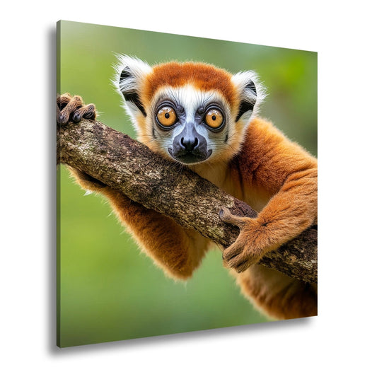 Leinwandbild Kulleräugiger Lemur – Klammert sich neugierig an Ast XXL