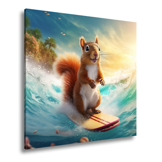 Leinwandbild Surfendes Eichhörnchen reitet tropische Welle XXL – Lustig Tiere
