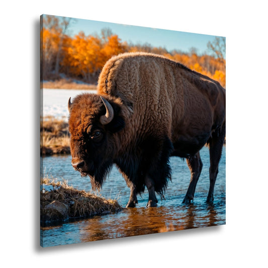 Leinwandbild Bison am Fluss im goldenen Herbstlicht XXL – Wildtiere Wandbild Wohnzimmer