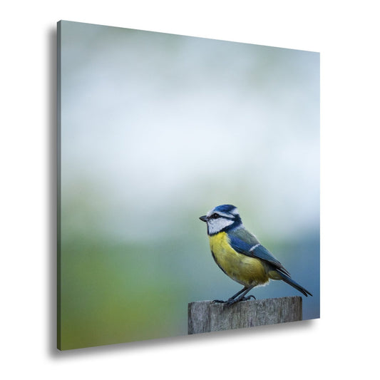 Leinwandbild Blaumeise auf Holzpfosten – Sanftes Morgenlicht XXL