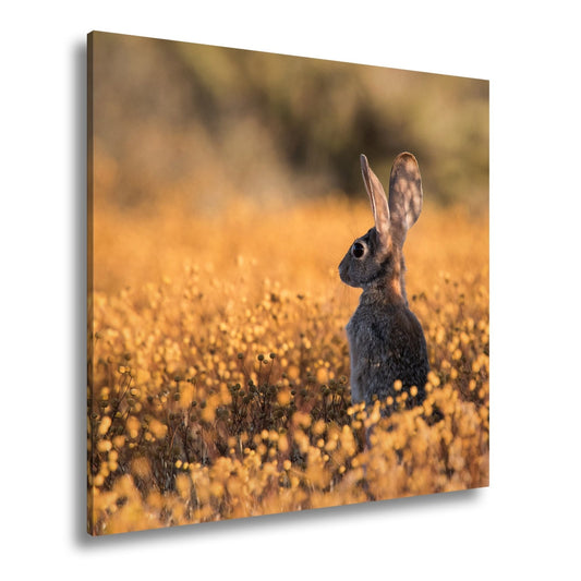 Leinwandbild Hase im goldenen Blütenmeer – Wachsam & still XXL