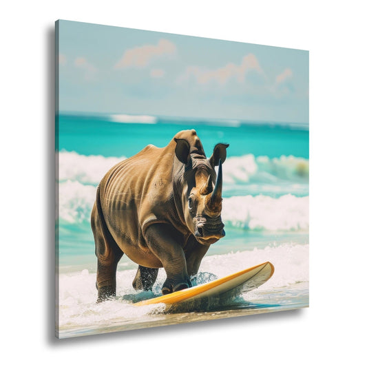 Leinwandbild Nashorn surft kraftvoll – Türkisene Wellen XXL