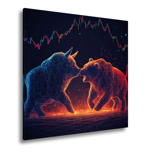 Leinwandbild Bulle trifft Bär – ein epischer Tanz der Märkte in Neonlicht.