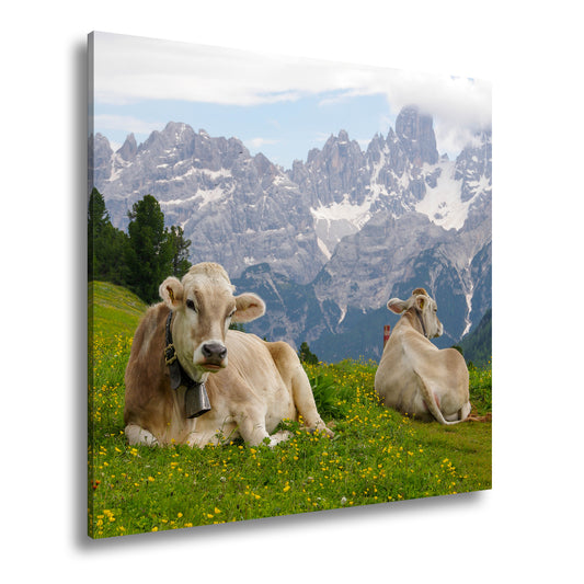 Leinwandbild Almidylle – Kühe ruhen vor majestätischer Bergkulisse.