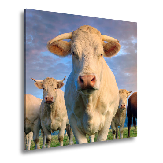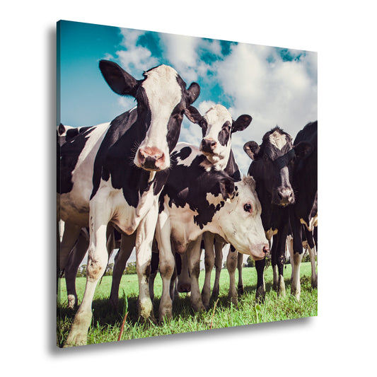 Leinwandbild Neugier im Blick – Kühe auf der Weide unter blauen Himmel.