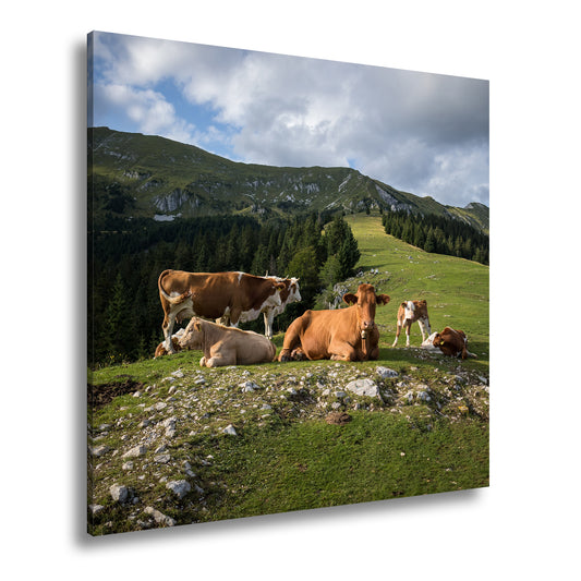 Leinwandbild Almidylle – Kühe ruhen sanft im grünen Bergparadies.