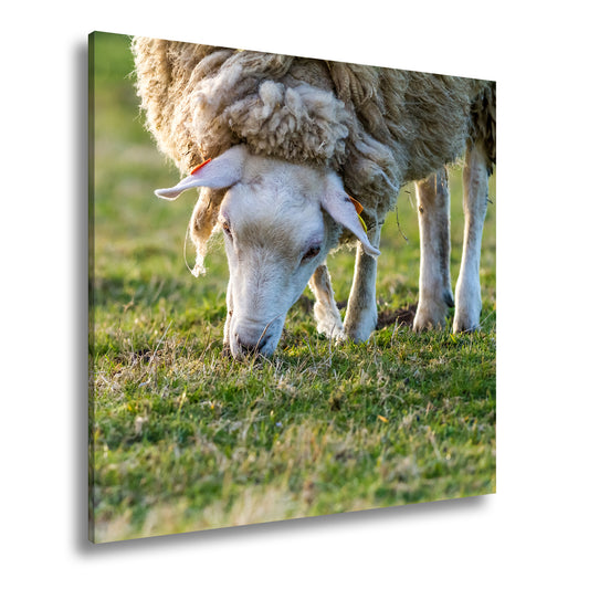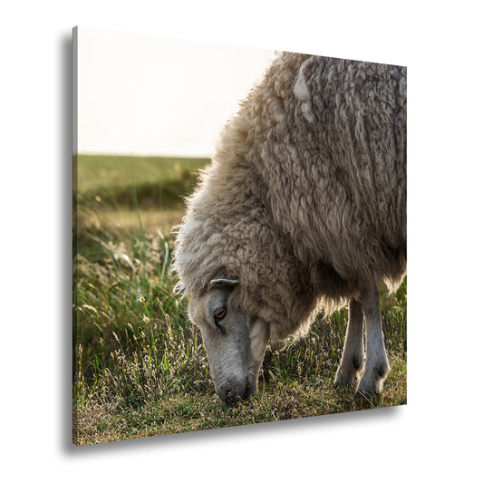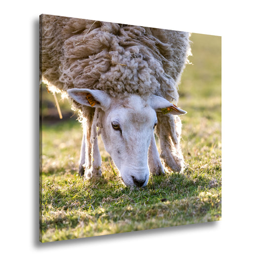 Leinwandbild Sanftes Weiden – Schaf in goldener Abendsonne vertieft.