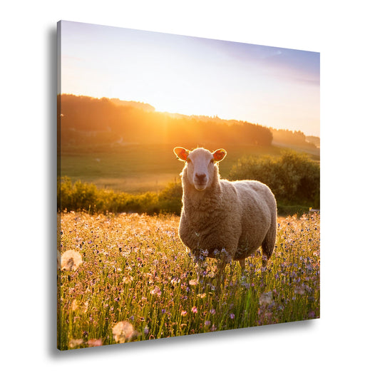 Leinwandbild Schaf im Blütenmeer, getaucht in goldenes Abendlicht.