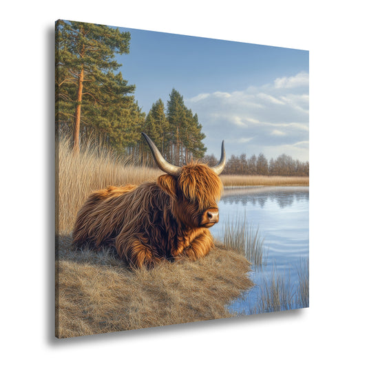 Leinwandbild Highland-Rind ruht am See, friedlich und majestätisch.