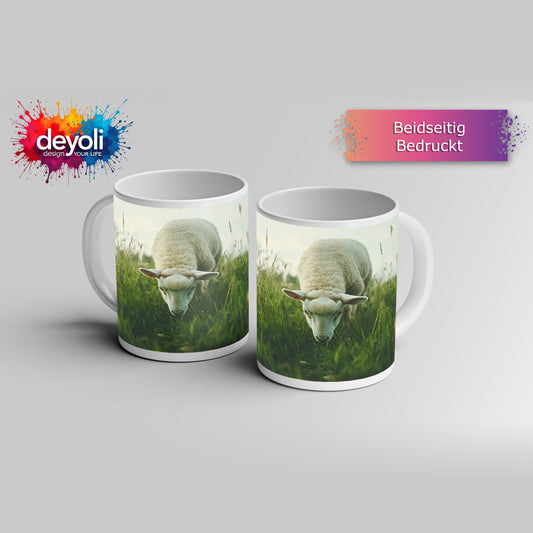 Motivtasse Schaf im Sonnenlicht – friedlich im grünen Morgen.