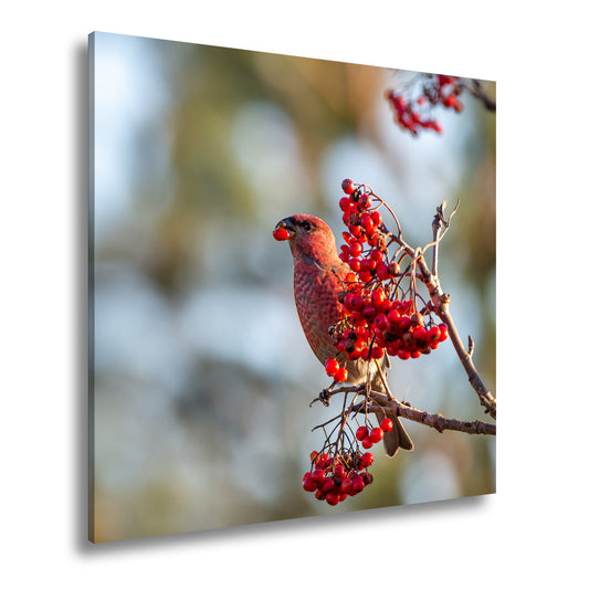 Leinwandbild Roter Vogel genießt Beeren im weichen Morgenlicht