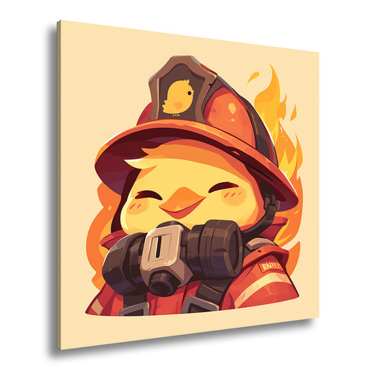 Leinwandbild Fröhliches Küken im Feuerwehranzug vor tanzenden Flammen
