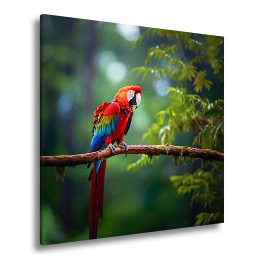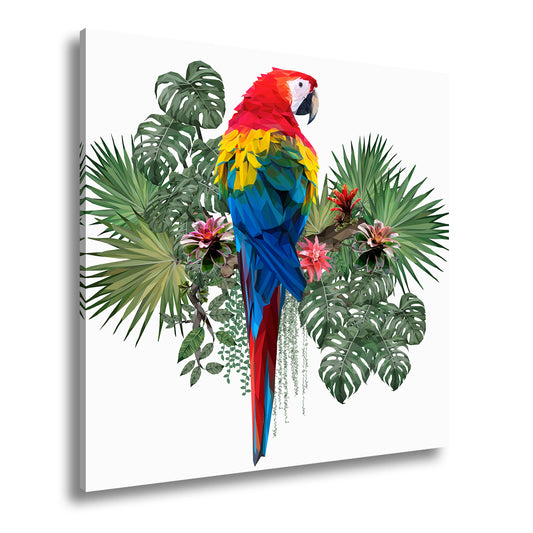 Leinwandbild Papagei leuchtet bunt im Tropengrün.