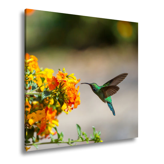 Leinwandbild Kolibri schwebt zwischen Flammenblüten in hellem Flug
