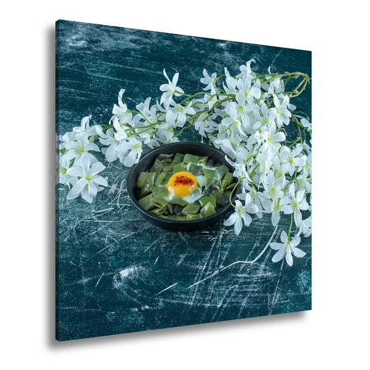 Leinwandbild Grüner Genuss mit Blütenzauber auf rauer Fläche