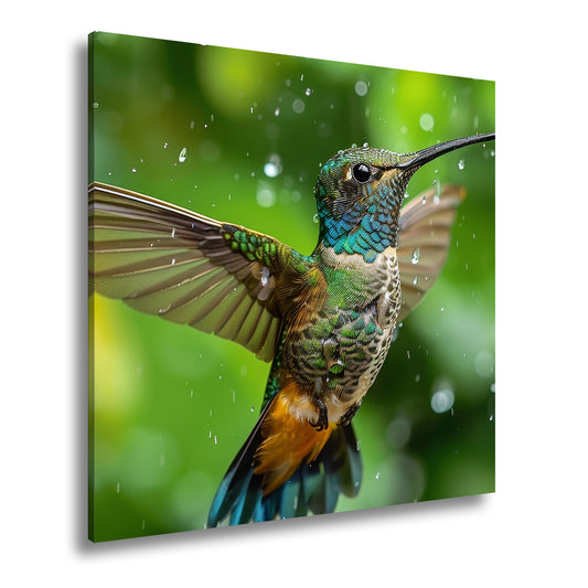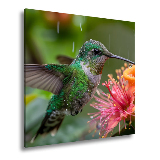 Leinwandbild Schillernd im Regen – ein Kolibri tanzt mit Tropfen.