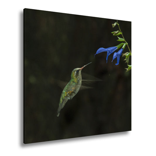 Leinwandbild Ein Kolibri küsst den Morgen in blauer Blütenpracht.