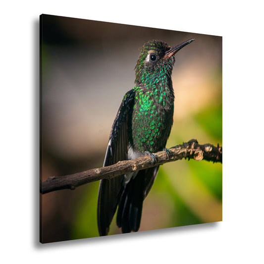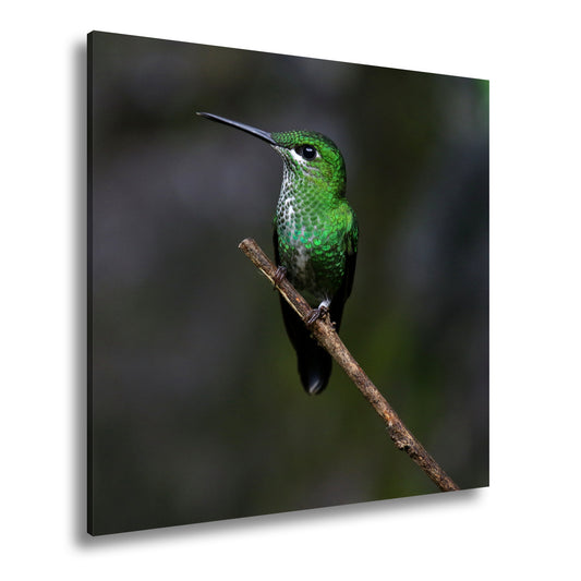 Leinwandbild Smaragdgrüner Kolibri ruht auf stiller Zweigspitze.