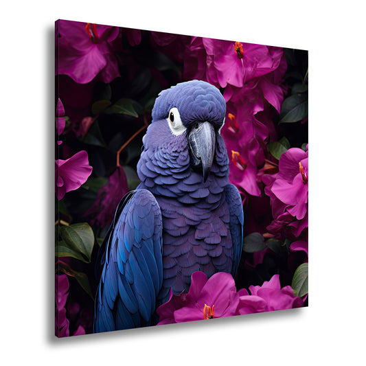 Leinwandbild Violettes Gefieder vor Blütenpracht – Exotik in voller Würde.