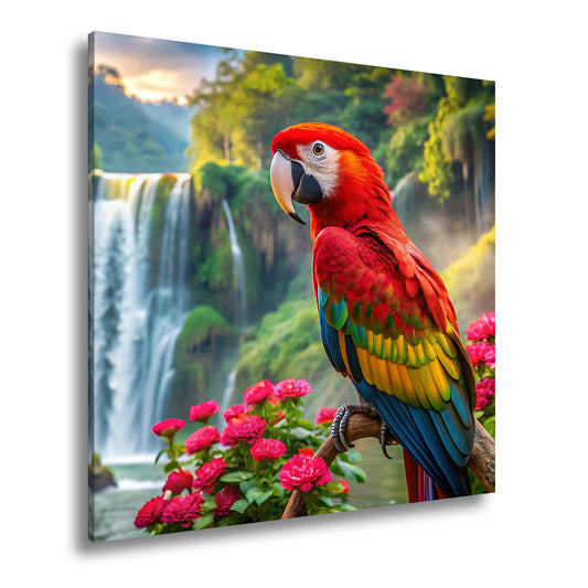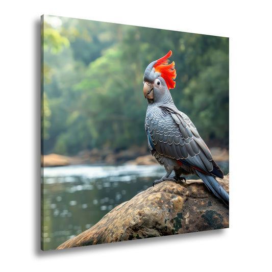 Leinwandbild Exotischer Papagei – stille Eleganz am Fluss des Dschungels.