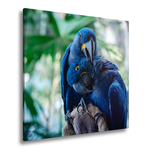 Leinwandbild Zärtliches Gefieder – zwei Hyazinth-Aras in Harmonie.