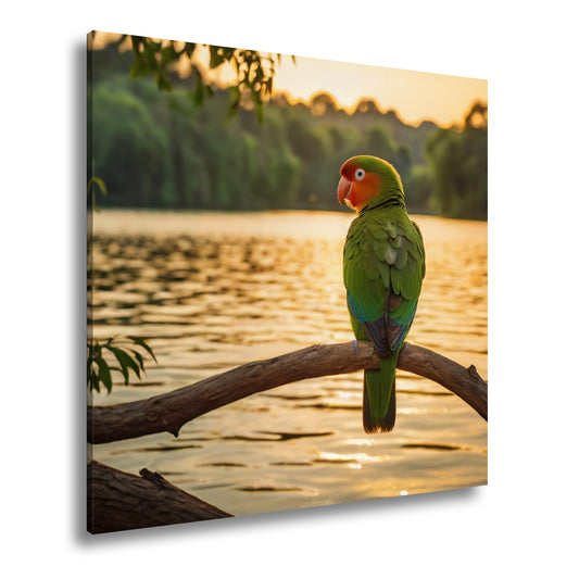 Leinwandbild Abendruhe – Papagei wacht über den goldenen See.