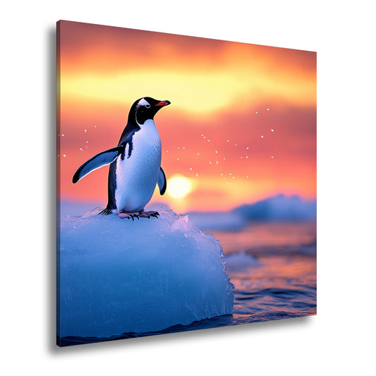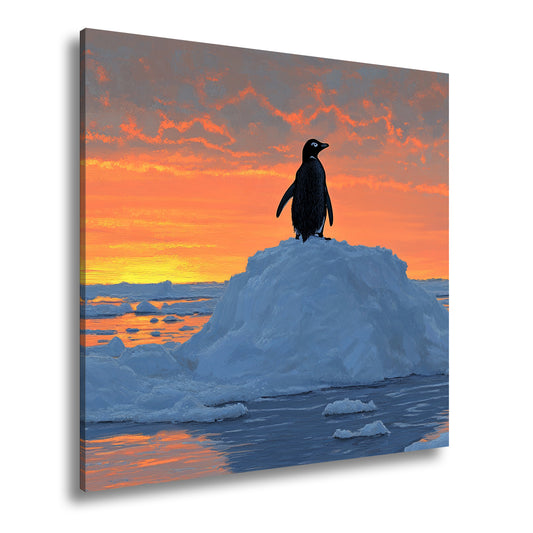 Leinwandbild Pinguin im Glanz – Eisiger Stolz vor flammendem Himmel.
