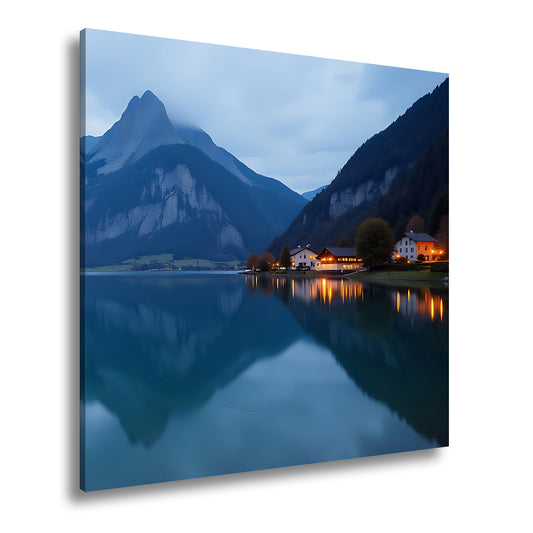 Leinwandbild Abendruhe am See – Spiegelbild der blauen Berge.