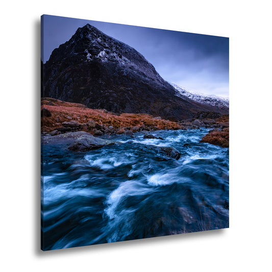 Leinwandbild Wildes Wasser vor Berg – Naturgewalt in stiller Dämmerung.
