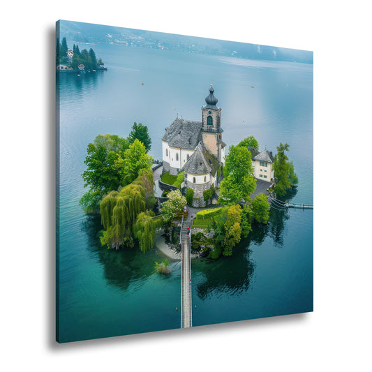 Leinwandbild Inselidylle – Ein Kirchlein ruht im Blau des Sees.