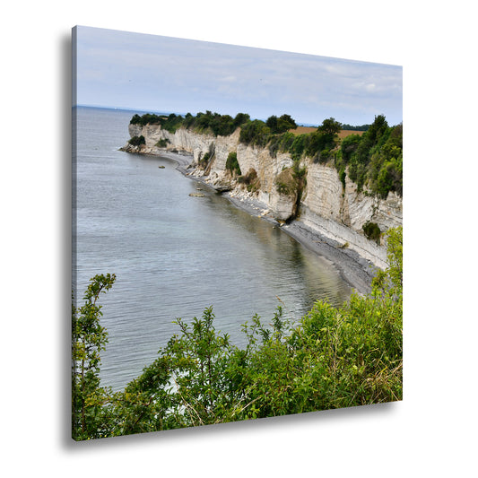 Leinwandbild Sanfte Brandung küsst steinige Küste und weiße Klippen.