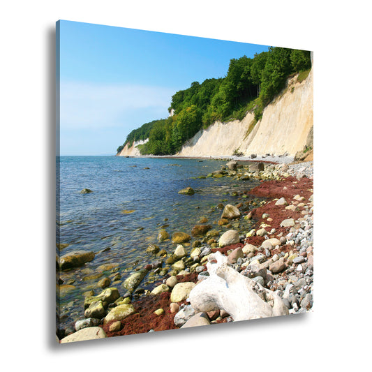 Leinwandbild Felsenküste ruht still am graublauen Meeressaum.