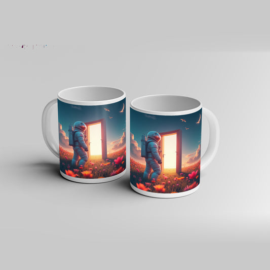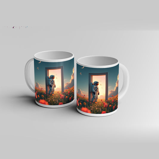 Motivtasse Astronaut tritt ein – zwischen Traum, Himmel und Tulpen.