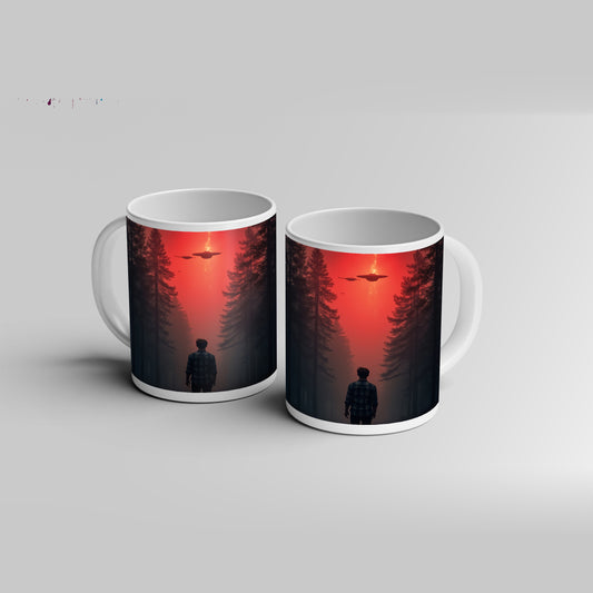 Motivtasse Ein roter Himmel, Ufos und Staunen im düsteren Wald.