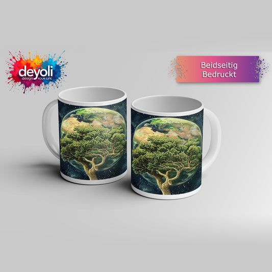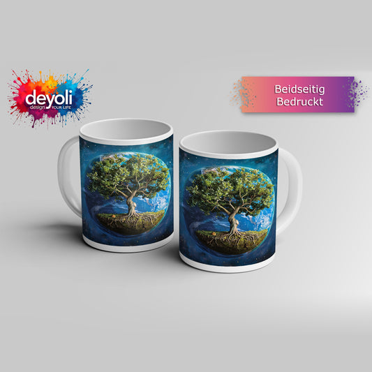 Motivtasse Wurzeln in den Sternen – die Erde ruht im Baum.