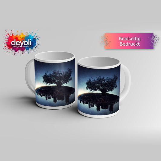Motivtasse Ein Baum schwebt durchs All, tief verwurzelt im Sternenflug.