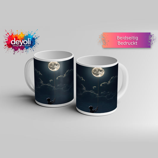 Motivtasse Kind hält den Mond wie einen Traum an einer Schnur
