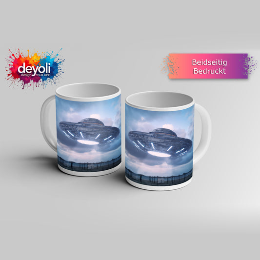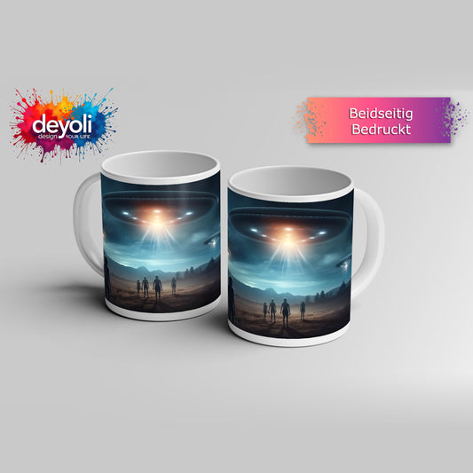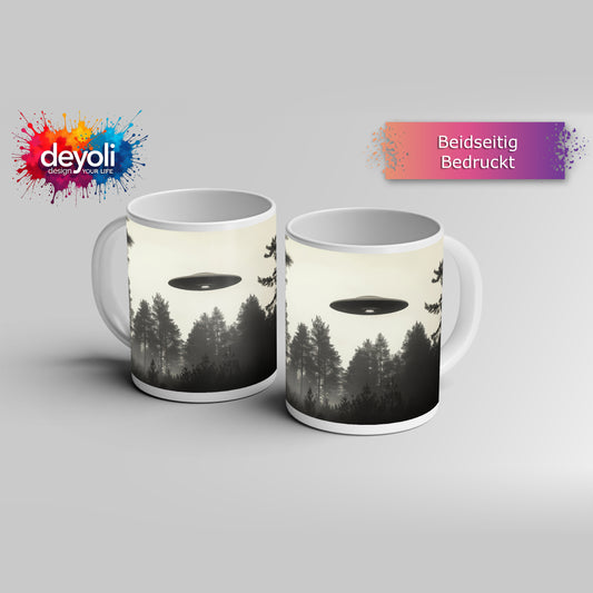 Motivtasse Fremdes Schweigen – ein UFO schwebt über dunklem Wald.