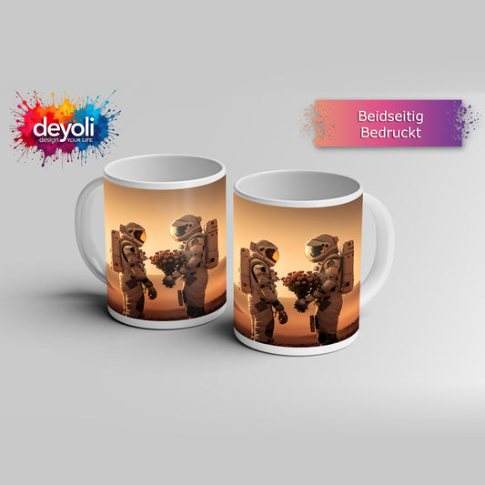 Motivtasse Liebe im All – zwei Astronauten teilen Blumen auf dem Mars.